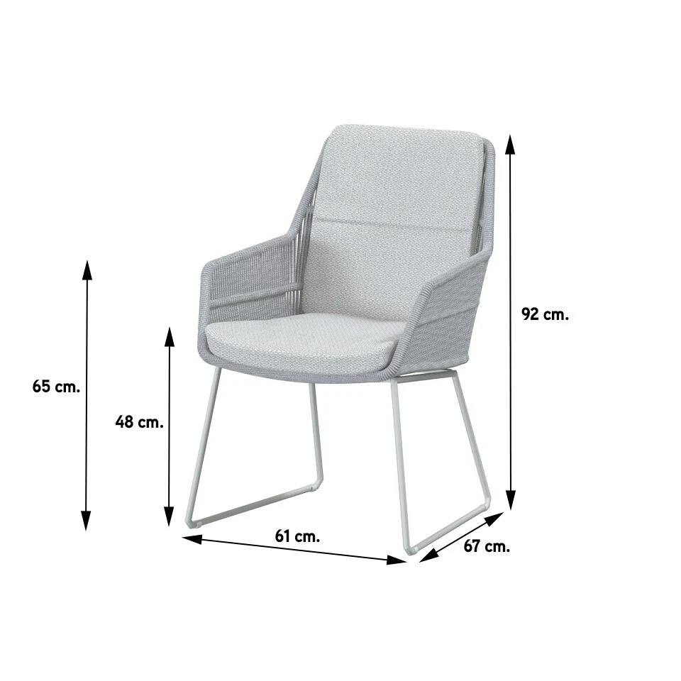 Het onderstel van de 4 Seasons Valencia tuinstoel is gemaakt van RVS. Dit materiaal is oersterk en heeft een stijlvolle uitstraling. Het RVS is behandeld met een beschermende coating in de kleur frozen, een lichtgrijze kleur. Deze coating zorgt ervoor dat het onderstel kras- en stootvast is. De zijkanten en rugleuning zijn afgewerkt met rope. Dit materiaal is het beste te omschrijven als een soort touw met een kunststof kern. Rope is kleurvast, Uv-bestendig en waterafstotend. Het voelt zacht aan en geeft een unieke uitstraling aan de Valencia tuinstoel. De comfortabele kussens zijn water en vuilafstotend en gemaakt van all-weather kwaliteit. De kussens zijn voorzien van afritsbare hoezen zodat je ze uit kunt wassen als ze vies zijn geworden. De hoezen zijn wasbaar op 30 graden.