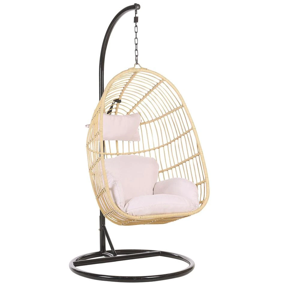 Moderne hangstoel in beige met zwart frame inclusief kussens. Een stabiel stalen frame gecombineerd met een prachtige gevlochten mand in een kleur die in elk interieur past en een feel-good karakter aan de ruimte geeft. Dankzij het sterke ketting-ophangsysteem kun je heerlijk heen en weer schommelen. De charmante boho-look van dit model en de zachte, waterbestendige kussens zorgen voor een onbezorgd gevoel, zodat het verblijf op de veranda, het balkon of in de slaapkamer een heerlijk avontuur wordt.