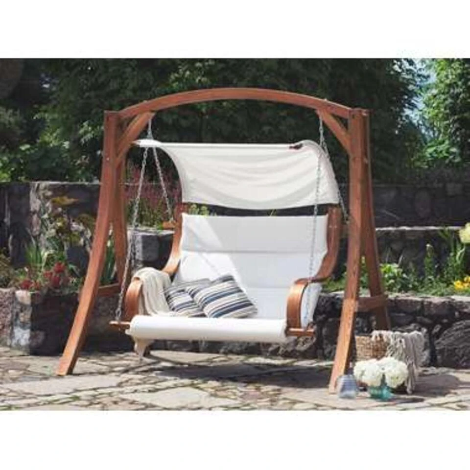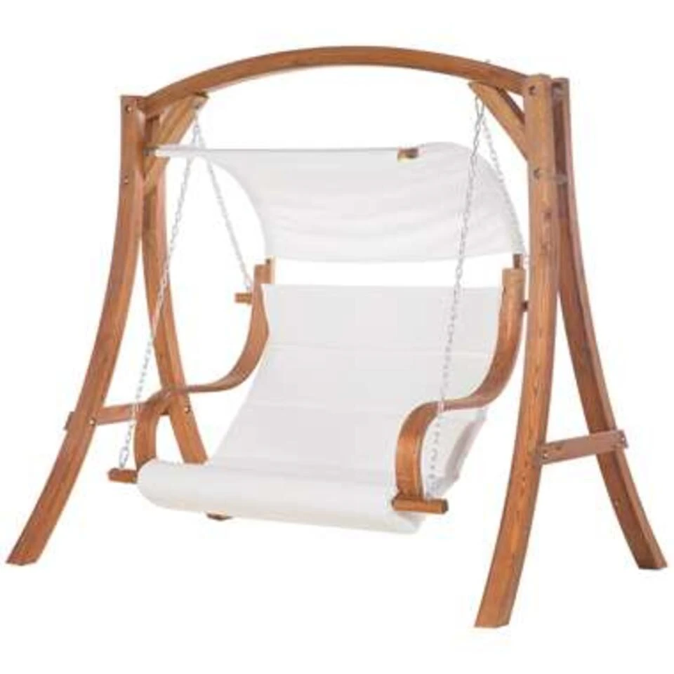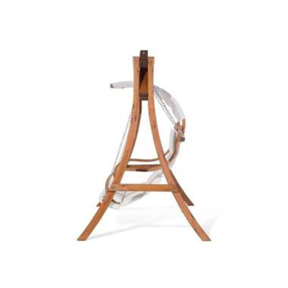Romantische schommelbank van larikshout. Deze prachtige schommelbank zorgt voor een vakantiegevoel in je eigen tuin! Het romantische ontwerp is gecombineerd met praktisch gemak. Het frame is gemaakt van stevig, larikshout en staat erg stabiel. De warm-bruine teak-kleur past mooi bij de heldere, comfortabele beige polyester-bekleding van de zitting. Deze bekleding is eenvoudig te reinigen met een vochtige spons. Door het grote zonnedak wordt je beschermt tegen de felle zon en de wind. Je kunt het zonnedak erg gemakkelijk demonteren waardoor het wassen hiervan mogelijk is (max. 40°C in de wasmachine). De kettingen zijn gemaakt van massief staal.