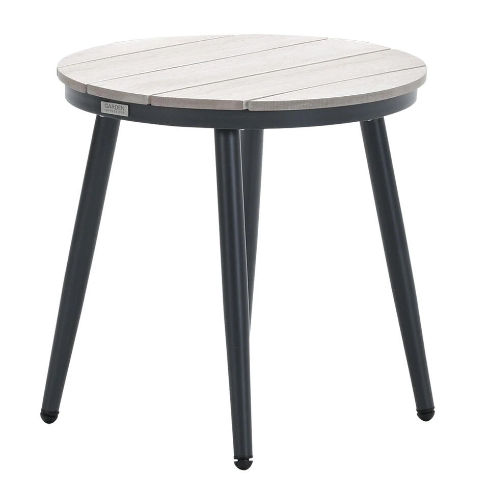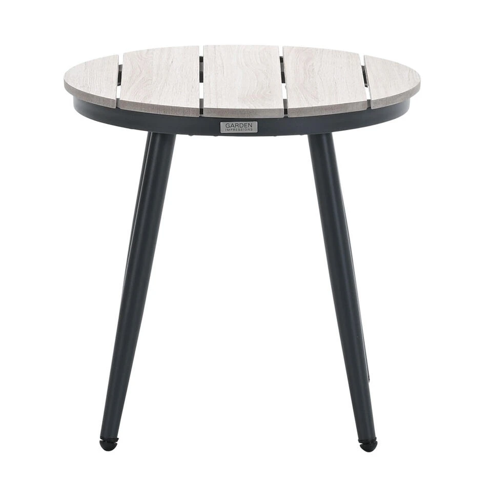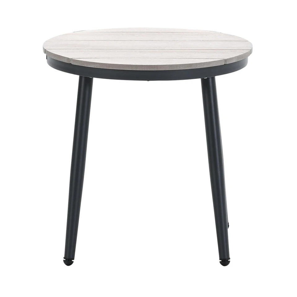 Het tafelblad is gemaakt van imowood latten, dit is een onderhoudsvriendelijke kunststof met een mooie houtuitstraling. Let wel op voor scherpe voorwerpen en vector vorming anders heb je zo krassen of smeltpuntjes in het imowood. Afmeting bijzettafel: Ø50 x 48 cm