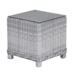 Handig Santa Rosa bijzettafeltje 45 x 45 x H46 cm met stevig aluminium frame, met daar omheen 5mm cloudy grey kleurig halfrond vlechtwerk draad. Dit bijzettafeltje met heldere glasplaat past mooi bij de verstelbare relax fauteuil en voetenbank in hetzelfde vlechtwerk. Een uitgebreide collectie bijzettafels vind je binnen de categorie tuinmeubelen. Tuinmeubelen van verschillende mooie merken.
