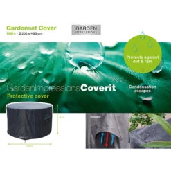 Ben je op zoek naar een beschermhoes voor jouw tuinset? Deze prettige tuinsethoes van kwaliteitsmerk Garden Impressions zorgt ervoor dat je langer plezier hebt van je tuinset. Om de levensduur van je tuinset te verlengen, raden wij aan om deze af te dekken in de wintermaanden. De tuinset beschermhoezen van Garden Impressions zijn gemaakt van PVC met een ademende coating. Deze coating zorgt ervoor dat hoes waterbestendig is. De hoes is niet volledig waterdicht, maar waterafstotend. Het is een flexibele ademende coating, waardoor de hoes in de wintermaanden ook nog flexibel blijft. Doordat de tuinsethoes niet volledig waterdicht is, is aan te raden om een afstand te creëren tussen de meubelen en de hoes. Het water kan er dan gemakkelijker afstromen en de meubelen kunnen niet verstikken. De beschermhoes is voorzien van ventilatie driehoeken zodat het tuinmeubel kan ademen. De tuinsethoes kan gemakkelijk om de tuinset worden bevestigd. Op alle hoeken zit onderaan een elastieken band om de hoes strak te houden. We raden je aan om de tuinkussens niet onder de hoes te laten liggen. Mochten de kussens al nat zijn geworden, is dat niet erg, maar zorg er wel voor dat ze droog worden opgeborgen. Tuinsethoes met afmeting Ø200xH85 cm.
