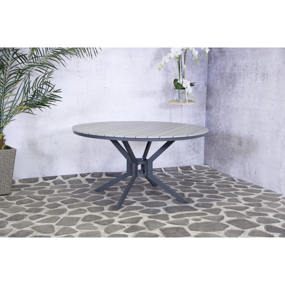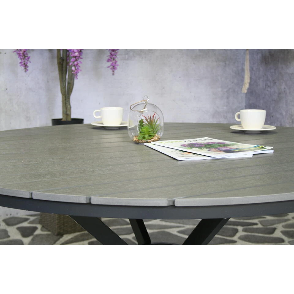 Gemaakt van een aluminium frame en voorzien van een polywood tafelblad. De planken van het tafelblad zijn voorzien van een voelbare hout stuctuur.
